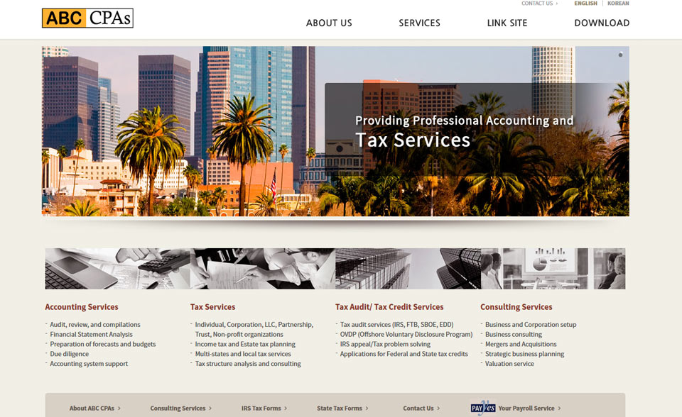 ABC CPA 사무실user_admin2017-08-03T19:20:00-07:00 ABC CPA 사무실 LA 지역 ABC CPA 사무실 웹사이트. 영문 및 한글 멀티 언어를 사용. Project Details Categories: 기업/회사 Project URL: www.abccpas.com/ Related Projects 뚜레쥬르 미국총본사 및 영업점 신한은행 카나다 KOTRA K-GLOBAL EXPO 2016 KOTRA BUSINESS EXPO 2015 KOTRA BUSINESS EXPO 2014
