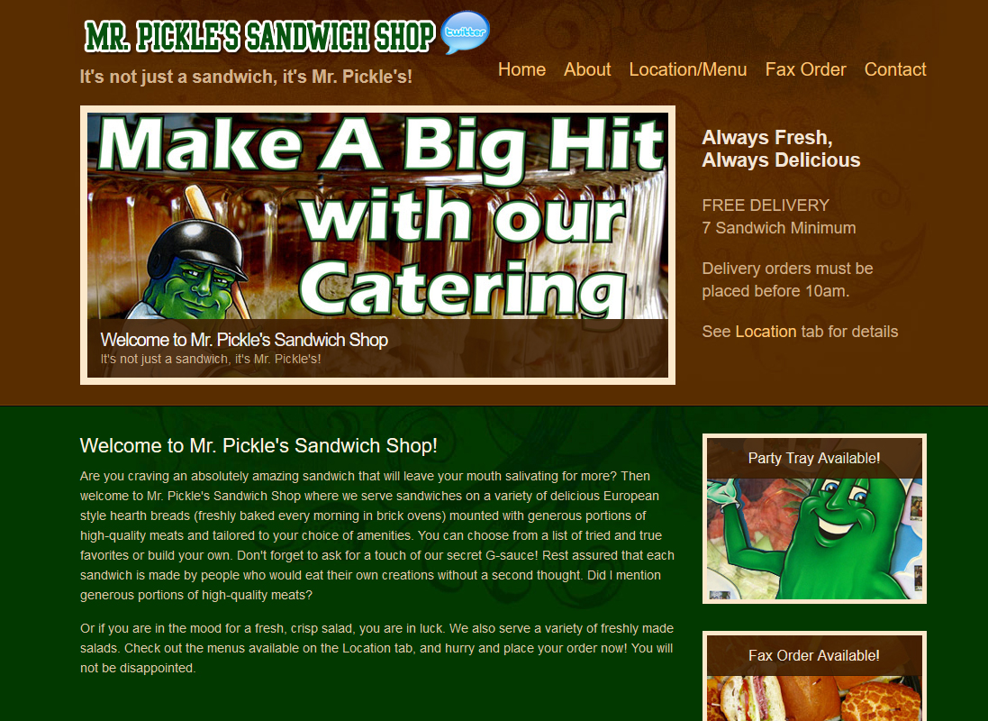 Roofing Doctoruser_admin2017-08-03T17:16:24-07:00 It’s not just a sandwich, it’s Mr. Pickle’s! 일반적인 서비스와 켈릭터를 강조한 로컬 서비스 중점의 음식점 웹사이트 입니다. 강한 켈리터를 중심으로 여러 장소에 체인점 형식의 비지니스. HTML 중심으로 제작. Project Details Categories: 스몰비지니스음식점/온라인주문 Project URL: www.mrpicklessandwich.com Related Projects OB Town 온라인 주문 Harumi Sushi 온라인 주문 Myasiaexpress 귀국 이삿짐 낙원식당 온라인 주문 Joolee hair 살롱