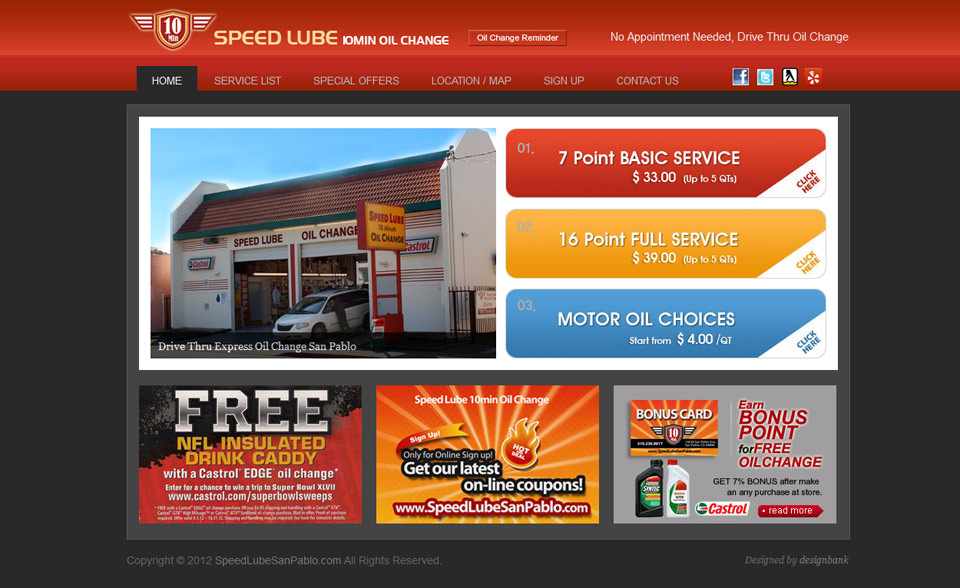 Speed Lube Sanpablouser_admin2017-08-03T20:57:22-07:00 Speed Lube Sanpablo 오일 체인지샾. Castrol oil 대리점 프로모션 이메일, 커스토머 관리 웹사이트 Project Details Categories: 기업/회사 Project URL: www.speedlubesanpablo.com Related Projects 뚜레쥬르 미국총본사 및 영업점 신한은행 카나다 KOTRA K-GLOBAL EXPO 2016 KOTRA BUSINESS EXPO 2015 KOTRA BUSINESS EXPO 2014