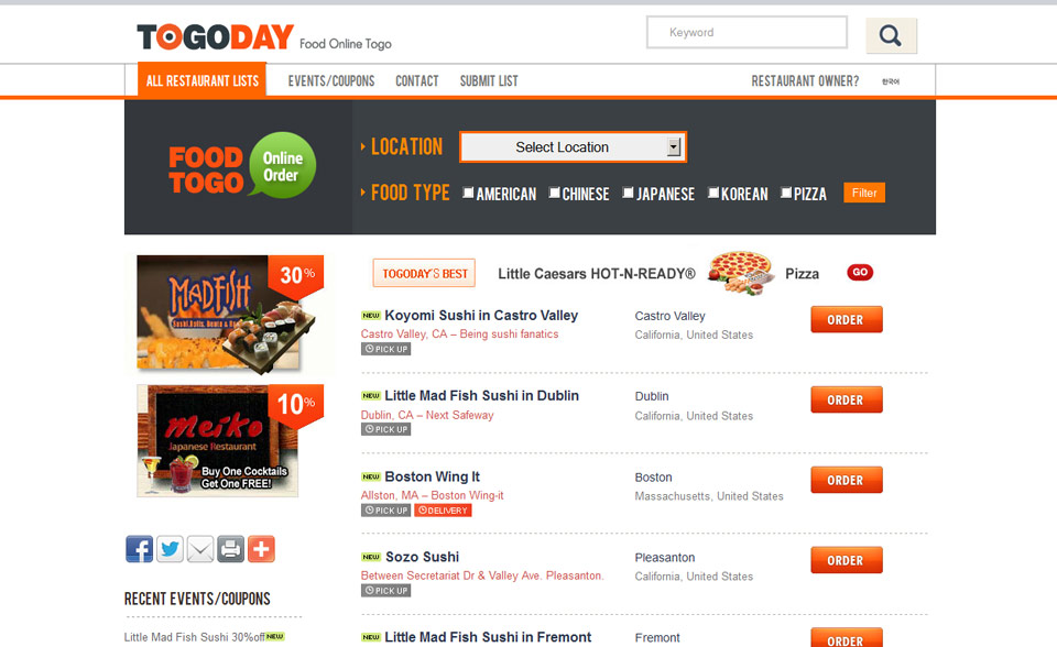 Togo Dayuser_admin2017-08-03T18:20:17-07:00 FOOD 온라인 주문 온라인 주문 음식점 리스트. Location, 음식점 종류를 선택 하여 음식을 주문 하는 토탈 리스트 웹사이트 Project Details Categories: 온라인 쇼핑몰음식점/온라인주문 Project URL: www.togoday.com/ Related Projects 유학생용 보험회사 온라인 결제 건강보험회사 온라인 결제 Best price mattress Autogalleryinc 중고차 판매 Interonutrition 건강식품 OEM 회사